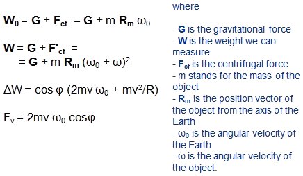 Previous | In rotating frame of referenceIn the rotating frame of reference the weight is the resultant force of the Earth's gravitational pull and the centrifugal force coming from the rotation of the Earth. In the case of stationary objects the weight doesn't change as the distribution of the Earth and its rotation velocity are constant. When an object is moving in the east-west direction, the Coriolis force is present. We get the same result as in the first case: ![]() We can ignore the second term because it is much smaller than the first one and what we get is exactly the vertical component of the Coriolis force. |
